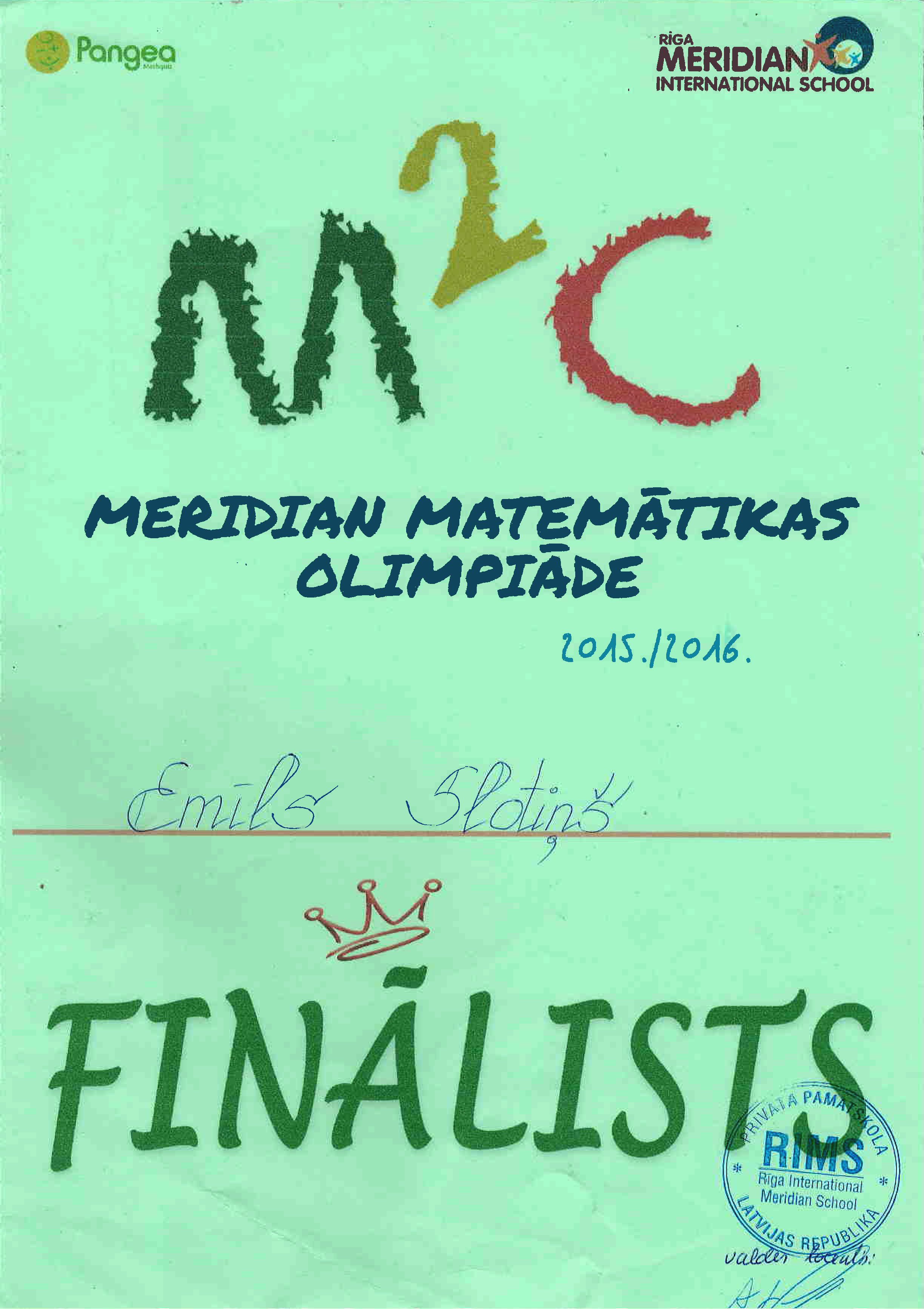 Apsveicam privātās pamatskolas “RIMS - Rīga International meridian school” rīkotās MERIDIAN MATEMĀTIKAS OLIMPIĀDES laureātus: